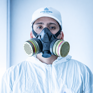 Equipo de protección respiratoria de medio rostro, que incorpora dos válvulas de inhalación de baja resistencia y una válvula de exhalación, facilitando la respiración y reduciendo la acumulación de vapor. Su arnés de ajuste rápido permite una colocación cómoda, segura y estable, asegurando un correcto sellado facial.